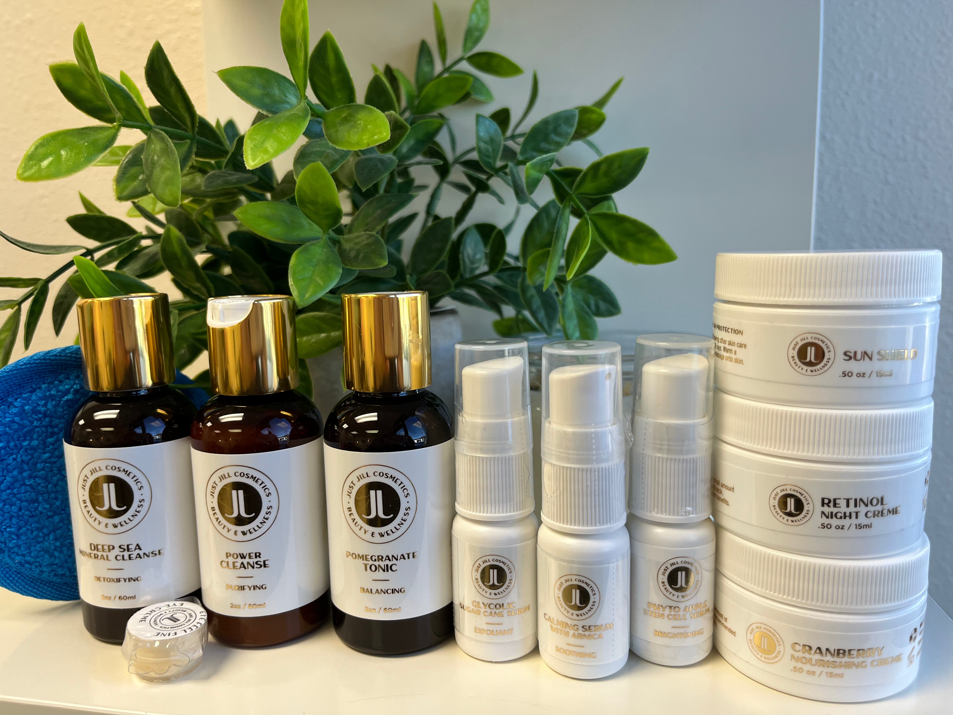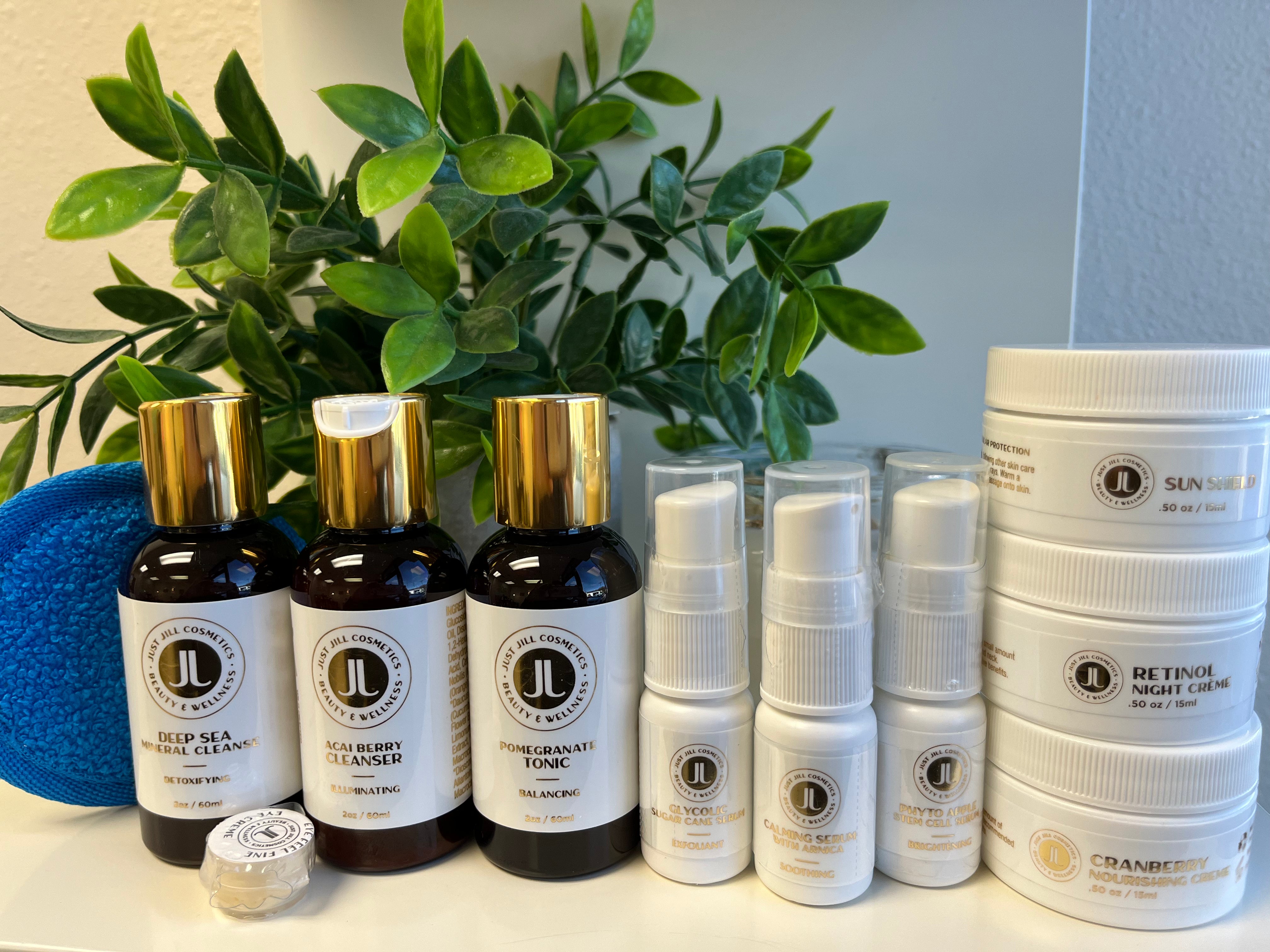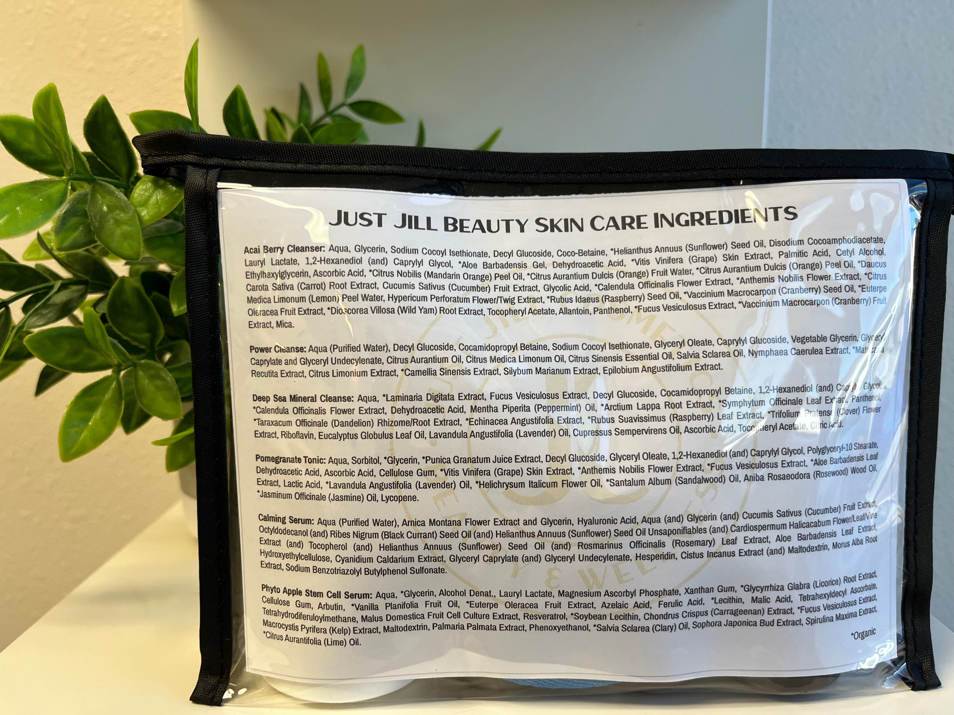 Anti-Aging/ Dehydrated: Acai Berry Cleanser 2oz., Deep Sea Mineral Cleanse 2oz., Pomegranate Tonic 2oz., Calming Serum 0.25 oz, Phyto Apple Stem Cell Serum 0.25 oz, Glycolic Sugar Serum 0.25 oz, Cranberry Nourishing Creme 0.5 oz, Sun Shield 0.5 oz, Retinol Night Creme 0.5 oz, Eye Creme 5 g. 1 microfiber cloth